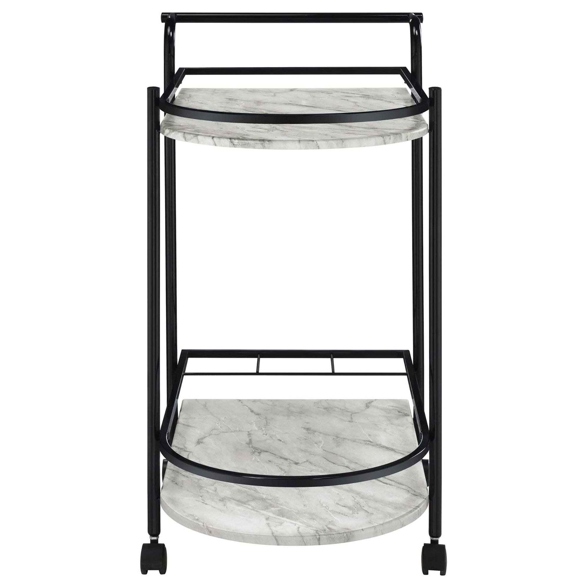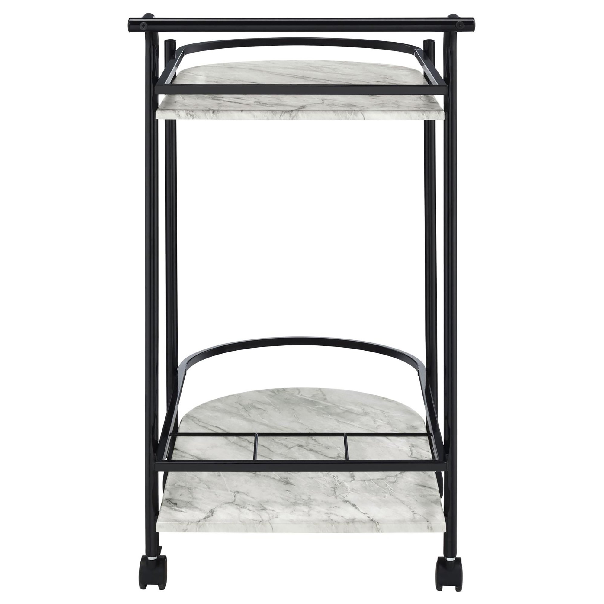 Romance CopyBe ready for entertaining contemporary style with this serving cart, a relic with retro design power and plenty of utility. This faux white marble finish cart with metal framing provides surface space on two levels for beverages, glassware, and incidentals, and includes caster wheels for portability to work a room.Product DetailsSet includesOne (1) serving cartDimensions32 inches high x 18.5 inches wide x 29 inches deepFinish colorFaux White Marble/ BlackMaterialsMDF, metal, PVCNumber of shelves2Wine rack3 bottlesCasters4 casters roll smoothly, with 2 lockable